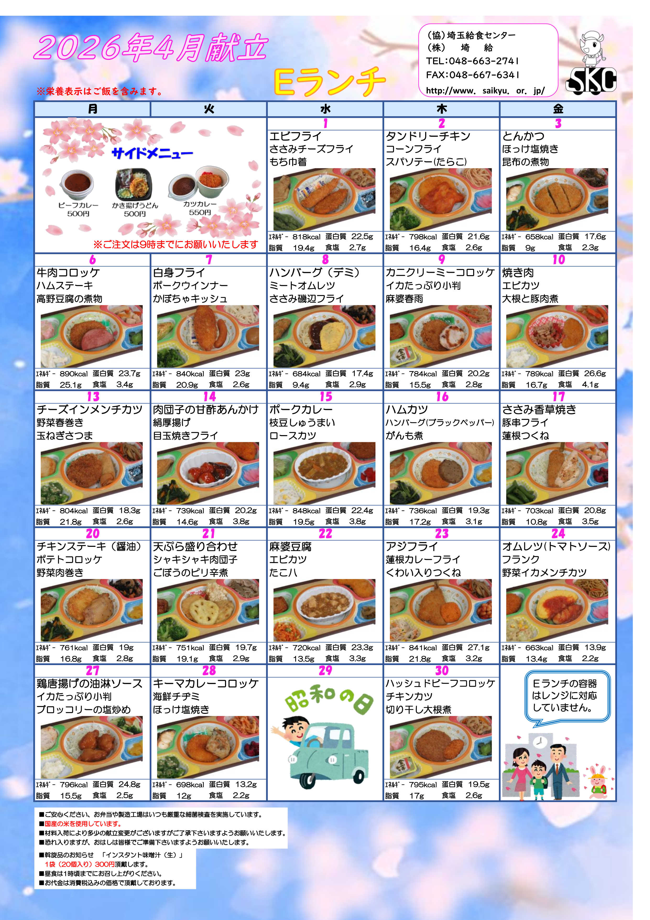 埼玉給食センターの献立はこちらからダウンロードできます。メニューをクリックすると別ウインドウで PDF版のメニューが開きますので、ブラウザのコマンドにて、印刷またはファイルのダウンロードをすることができます。